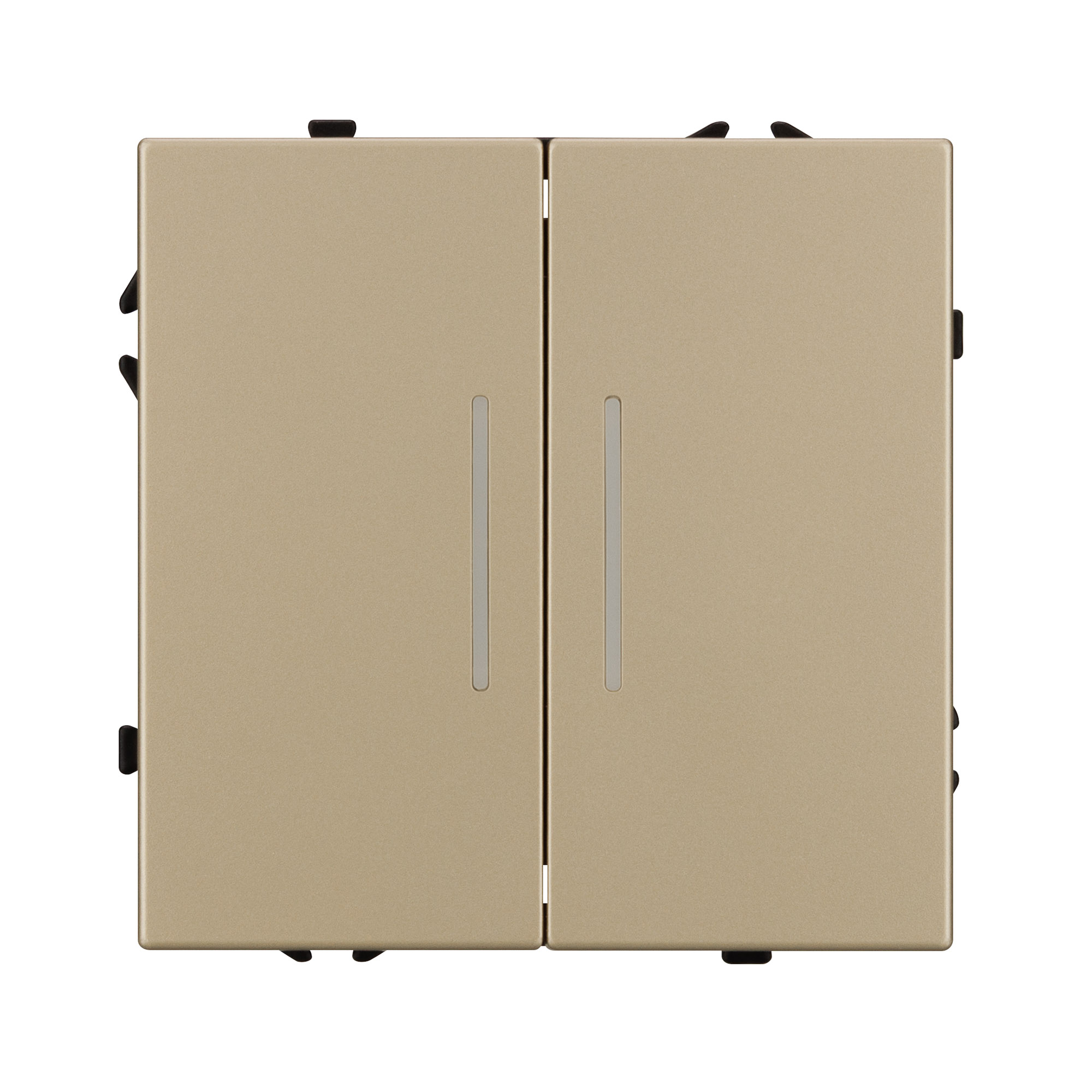 Механизм выключателя света клавишный на 1 пост 2 клавиши (непроходной). Цвет - золотой, с Soft-Touch покрытием. Клавиша имеют активную LED подсветку - cинего свечения. Без фронтальной рамки. Уровень пылевлагозащиты IP20. Выключатель устанавливается в стандартный круглый подрозетник круглого сечения диаметром 60мм.