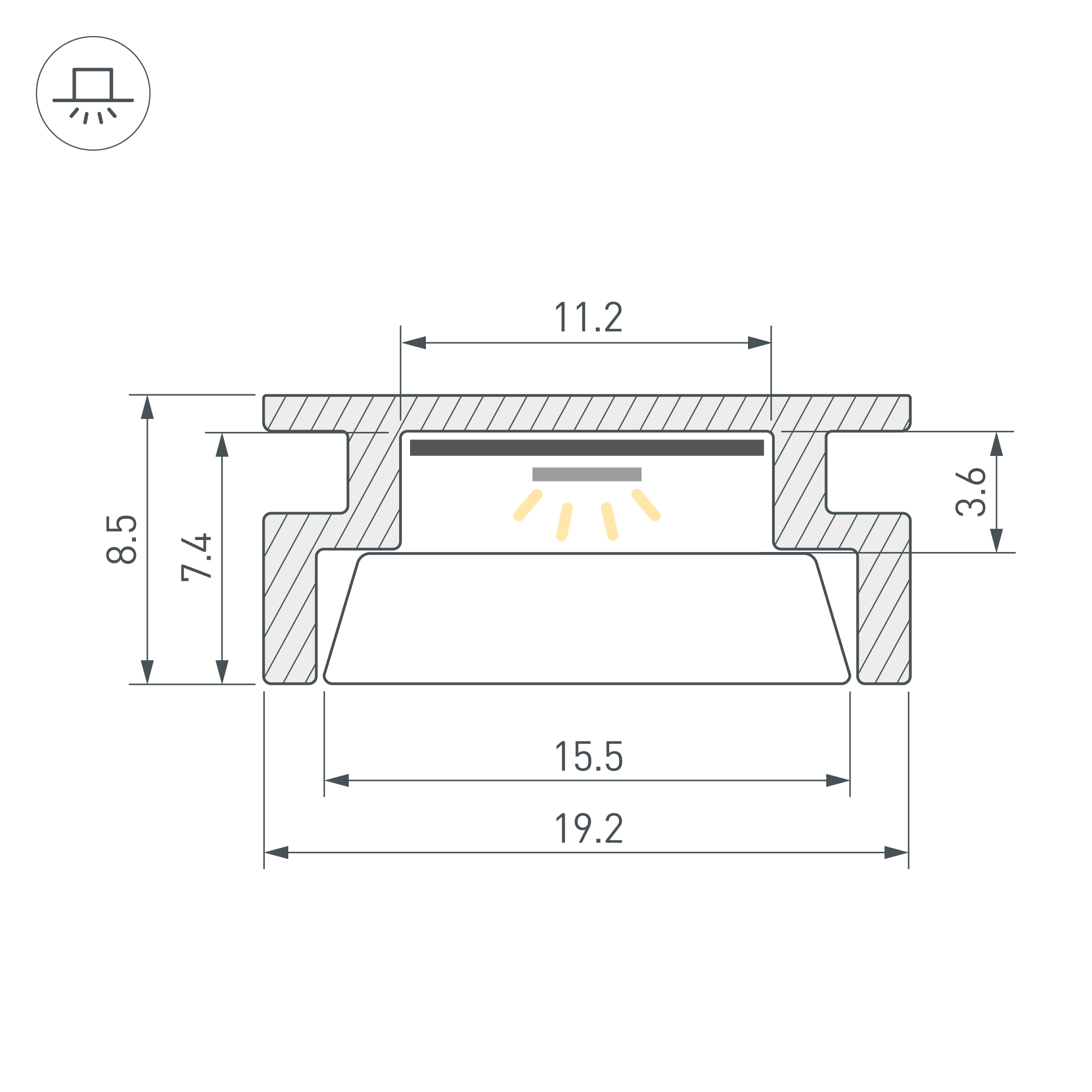 Алюминиевый анодированный профиль, встраиваемый в пол. Высокопрочный алюминий. Герметизация до IP67. Для использования внутри помещений. Габаритные размеры (L×W×H): 2000x19,2x8,5 мм. Ширина площадки для ленты 11,2 мм. Экран (из сверхпрочного поликарбоната, УФ-устойчивый), заглушки и другие аксессуары приобретаются отдельно. Цена за 1 метр.