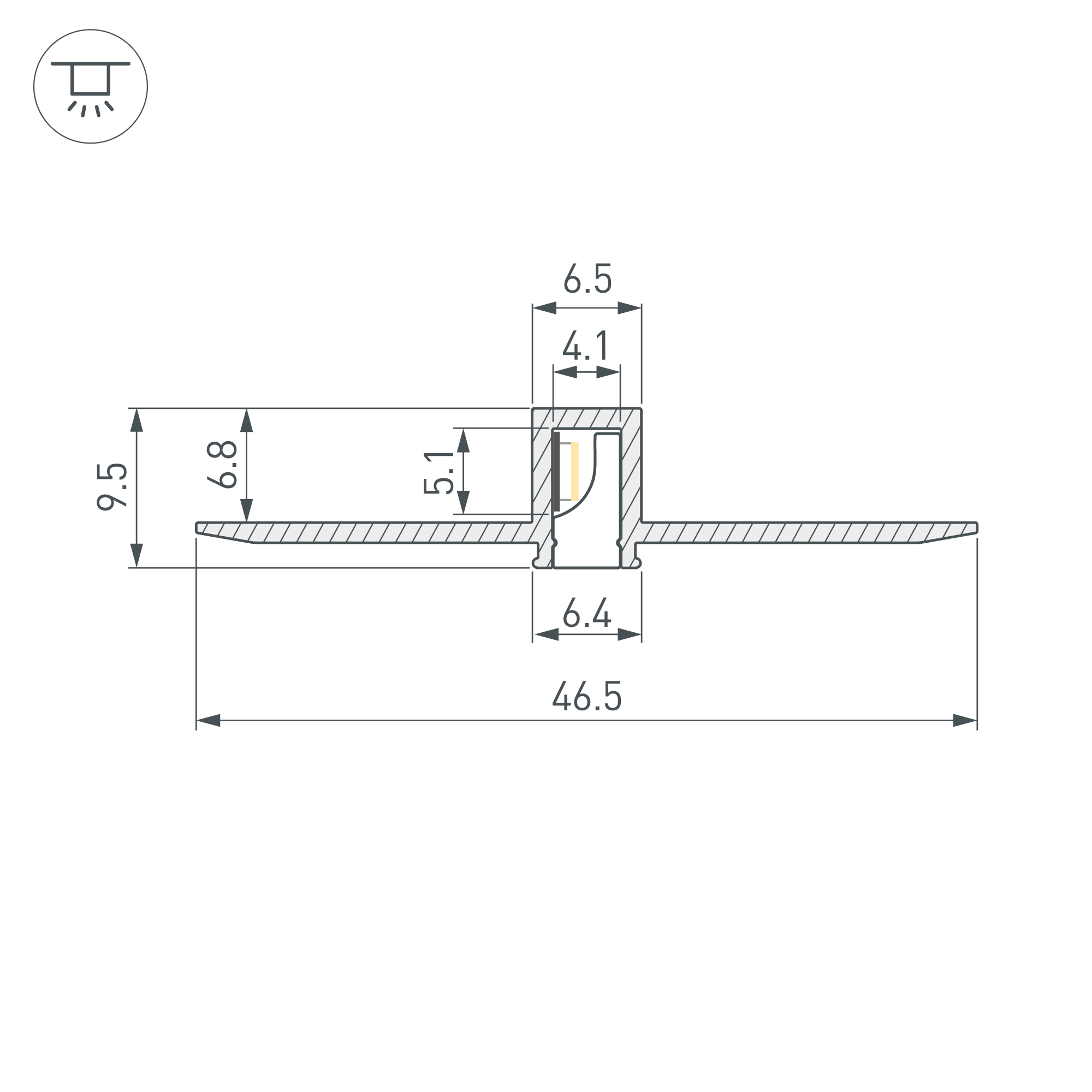 Алюминиевый анодированный профиль для светодиодных лент и линеек. Скрытая установка (под строительную отделку). Габаритные размеры (L×W×H): 2000x46,5x9,5 мм, паз для установки 6,5х6,8 мм. Ширина площадки для ленты 5 мм. Экраны приобретаются отдельно. Цена за 1 метр.